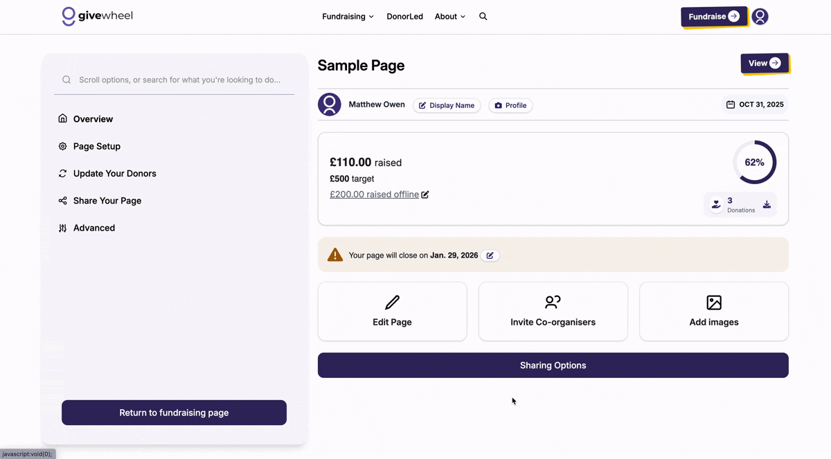 To generate a QR code, head to your page's Edit menu by selecting the edit icon on your fundraising page.