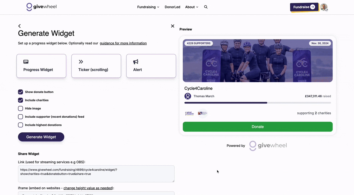 GiveWheel provides a pre-built customisable widget suitable for use in third-party websites or video broadcast software. You can customise your widget onsite at GiveWheel, and then copy the code to embed this wherever you see fit. The widget provides a quick insight into your fundraising page, and a quick link for your supporters to donate.
