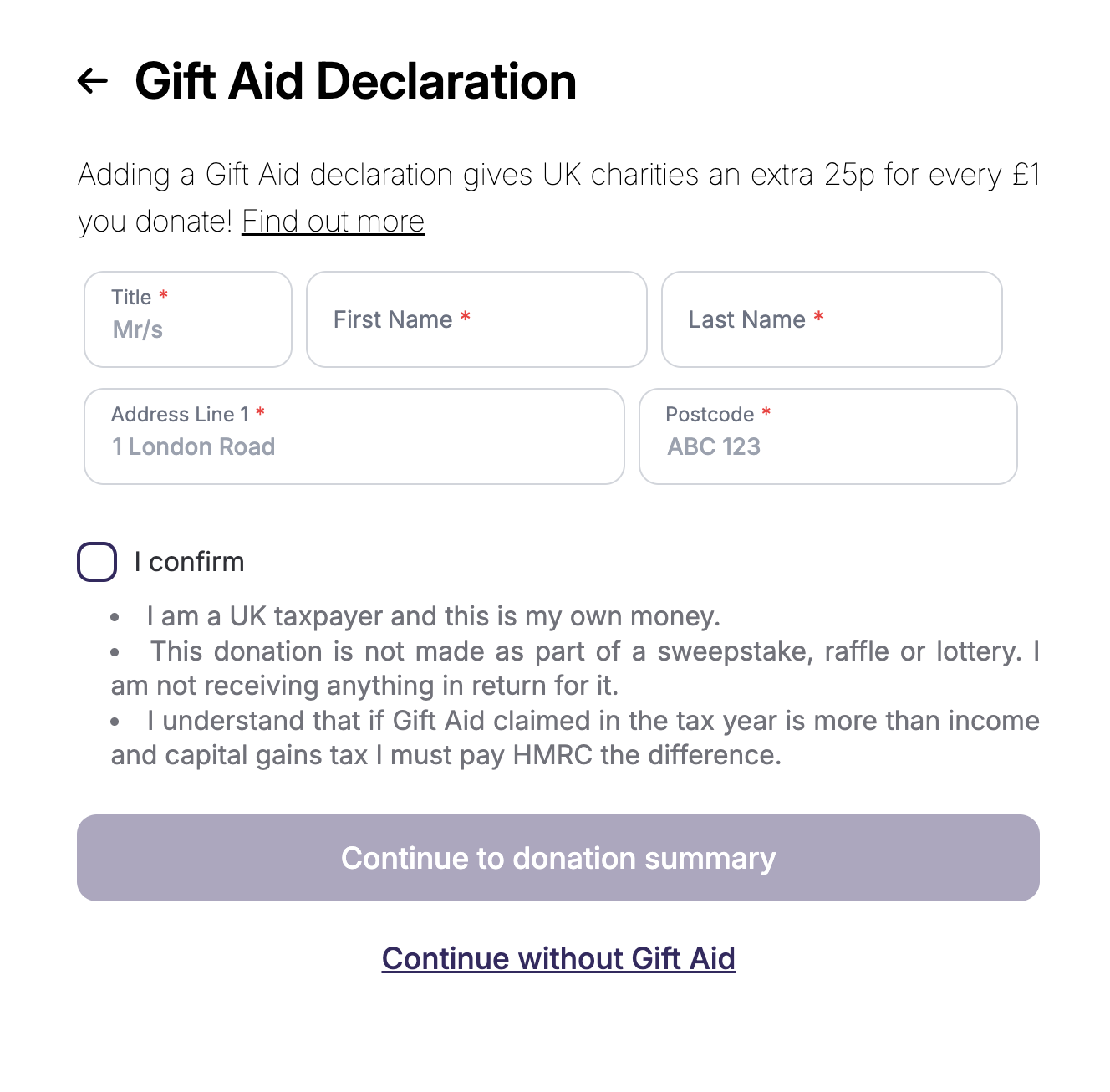 When you make a donation to an eligible page, you'll have the option to complete a Gift Aid declaration to ensure the recipient charities are able to reclaim Gift Aid.
