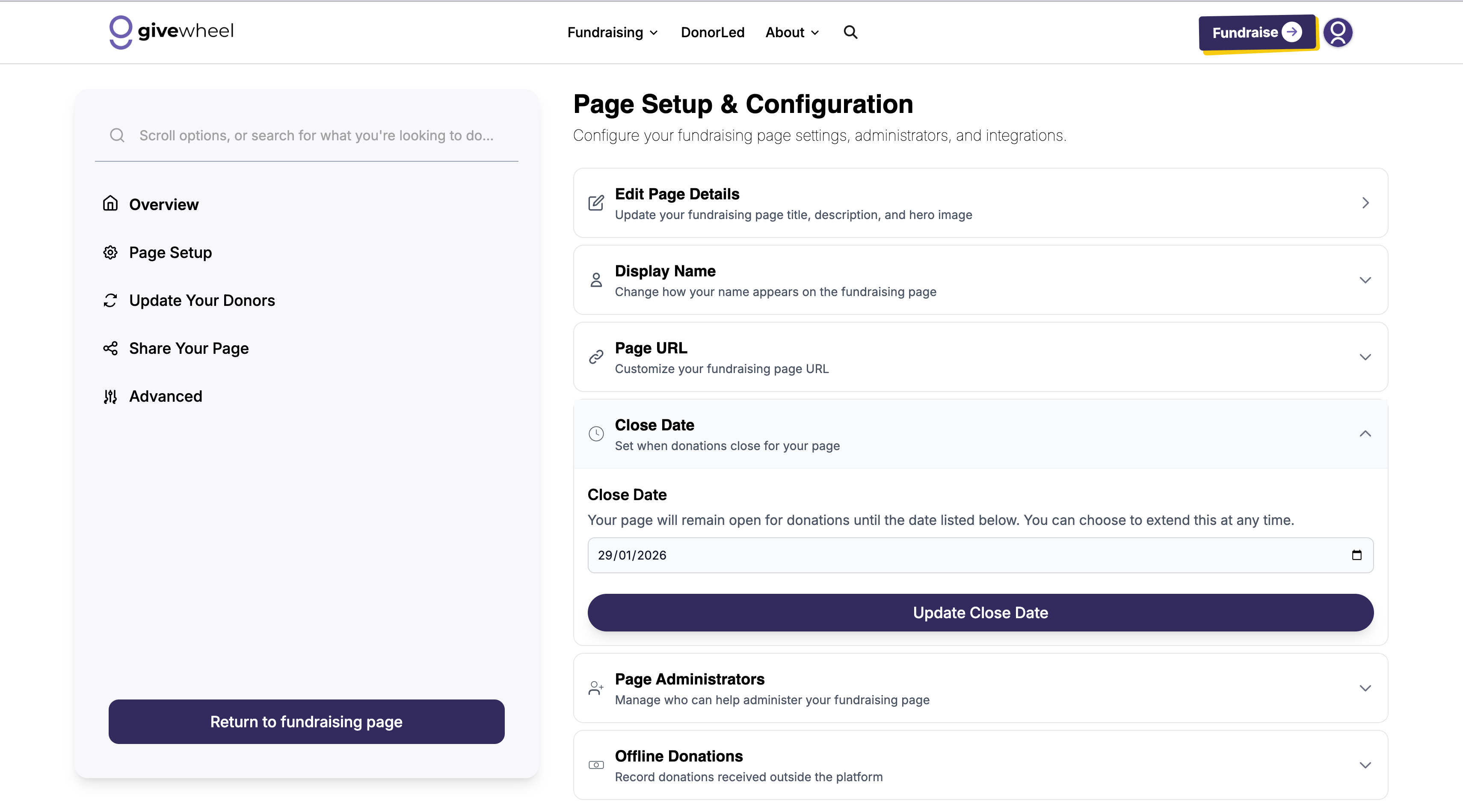 You are welcome to set your page to close earlier, or later than this date. Simply navigate to your Manage Event page from your fundraising page, select 'Page URL and close date' from the left hand sidebar and enter your desired close date. There's no limit on how long fundraising pages can remain open for, and you are able to change your close date as many times as you wish.